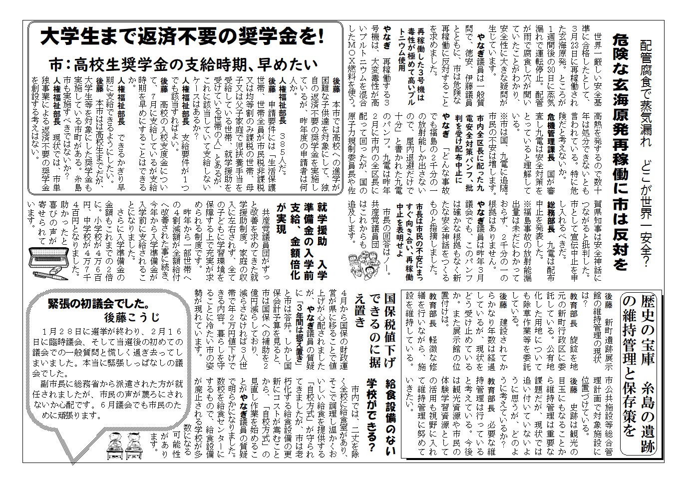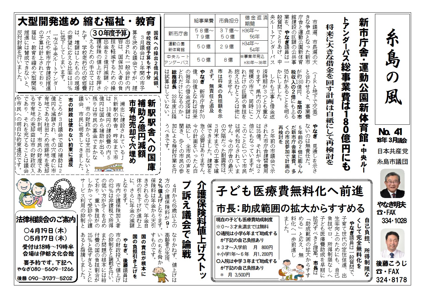 糸島の風 2018/04/01 糸島の風2018年3月議会号 糸島の風2018年3月議会号(No.41)です <主な記事> 新市庁舎・運動公園新体育館・中央ルートアンダーパス、総事業費は180億円にも 大型開発進め、縮む福祉・教育 新駅駅舎への国庫補助2億円減額 市有地売却で穴埋め 子ども医療費無料化へ前進 市長「助成範囲の拡大からすすめる」 介護保険料値上げストップ訴え議会で論戦 危険な玄海原発再稼働に市は反対を 大学生まで返済不要の奨学金を! 歴史の宝庫 糸島の遺跡の維持管理と保存策を 国保税値下げできるのに据え置き 給食設備のない学校ができる? オモテ面 ウラ面